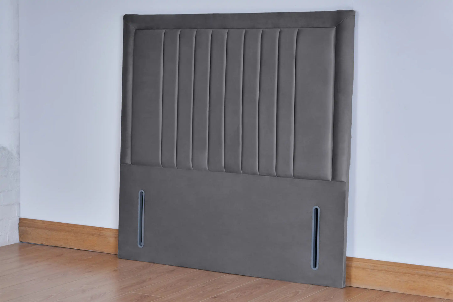 The Dartmouth Floor standing headboard is a modern and sleek design with vertical channel tufting. It is upholstered in a plush, fabric that adds a touch of luxury and sophistication to the overall look. The headboard is tall, providing a bold statement piece for the bedroom, ensuring a cohesive and stylish. Its high, imposing structure adds a dramatic flair to the bedroom, making it a focal point of the space. The choice of fabric and the meticulous craftsmanship of the tufting highlight the attention to detail and quality of the headboard, making it a sophisticated addition to any contemporary or modern bedroom decor.