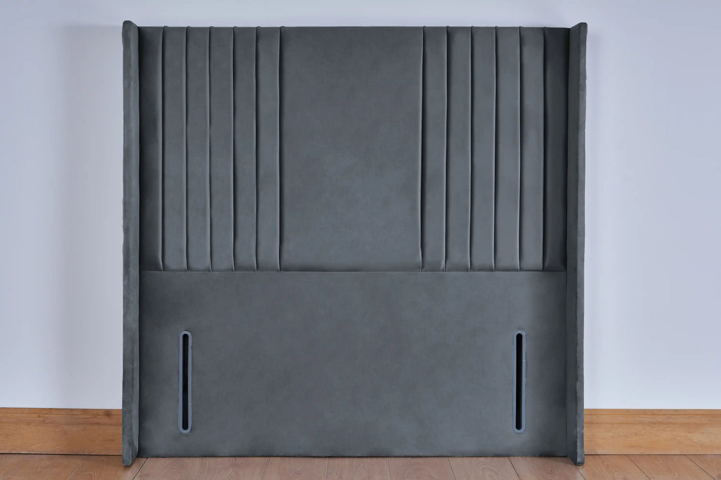 The Flintshire Wing Headboard is elegantly upholstered in fabric that offers a tactile sense of luxury and comfort. The design features vertical channel tufting, creating a series of evenly spaced, parallel ridges that add a modern, streamlined aesthetic to the piece. This tufting technique not only enhances the visual appeal but also provides a soft, padded surface, ideal for leaning against while sitting up in bed. The headboard extends down to meet the side panels seamlessly, ensuring a cohesive and unified look. Its high, imposing structure adds a dramatic flair to the bedroom, making it a focal point of the space. The choice of fabric and the meticulous craftsmanship of the tufting highlight the attention to detail and quality of the headboard, making it a sophisticated addition to any contemporary or modern bedroom decor.