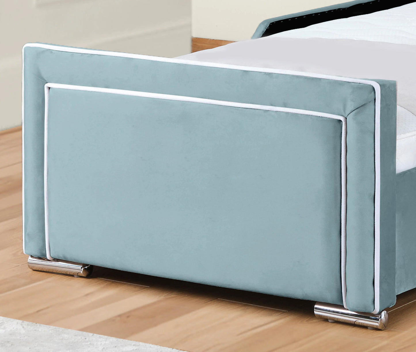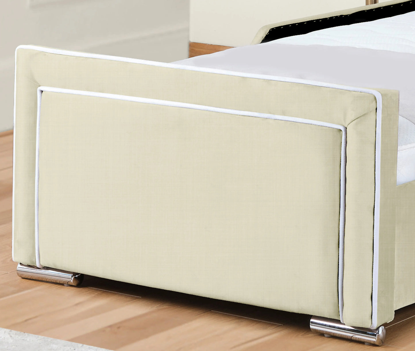The footboard in the image shares the same sophisticated and contemporary design as the headboard. It is covered in fabric, matching the headboard for a cohesive look. The footboard features a rectangular shape with a padded surface, ensuring both comfort and style. It is framed by a slightly darker grey piping, which mirrors the detailing on the headboard and adds a touch of elegance. The clean lines and minimalist design of the footboard make it a versatile addition to various bedroom styles, complementing the overall modern aesthetic of the bed. The footboard's height is proportionate to the bed, providing a balanced and symmetrical appearance. The fabric upholstery gives it a soft, inviting look, making the bed an attractive focal point in the room.